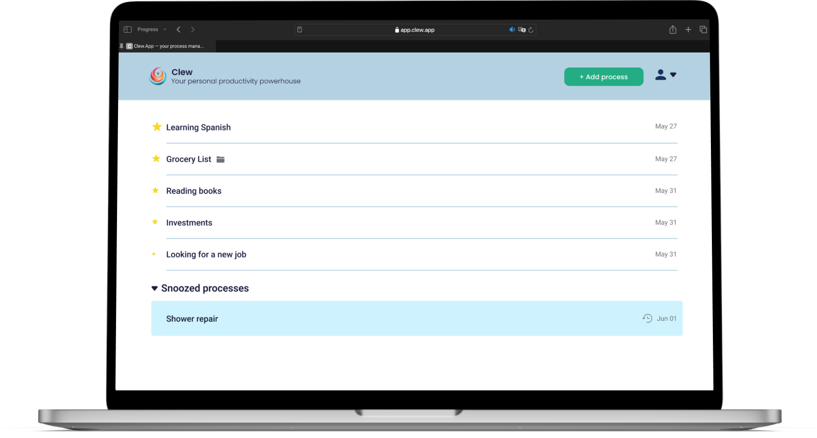 A process frame is a tool that helps you organize your processes according to the methodology of the Clew application. It includes the formulation of the goal of the process, the identification of key milestones and tasks, and recommendations for managing priorities.